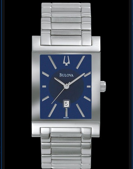 Blue patterned dial. Stainless steel case and bracelet. Deployment buckle. Water resistant to 30 meters/100 feet.
