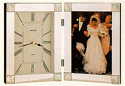 Hinged metal case, Chrome finish, 5" x 7" photograph opening, Protective glass lens, 3.25" x .75" engraving plate included.