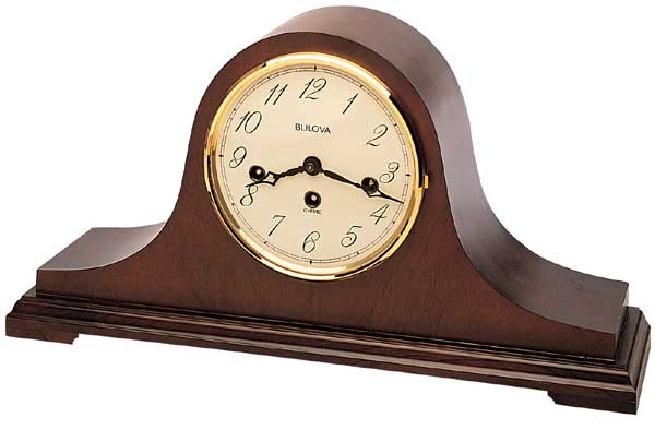 Wood case, Dark walnut finish, Hinged brass bezel with convex glass over metal dial, Solid brass German movement plays Westminster chimes on the quarter hour, Counts the hour.