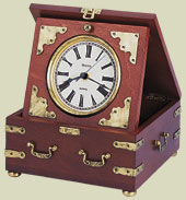 Wood and wood veneer case, Rustic walnut finish, Antique metal accents and handles, Antique gold tone bezel, Protective glass lens.