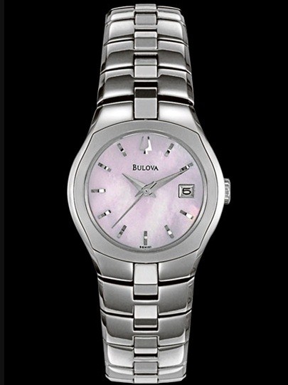 In stainless steel with pink mother-of-pearl dial, calendar, second hand, mineral crystal, deployment buckle and water resistance to 30 meters.