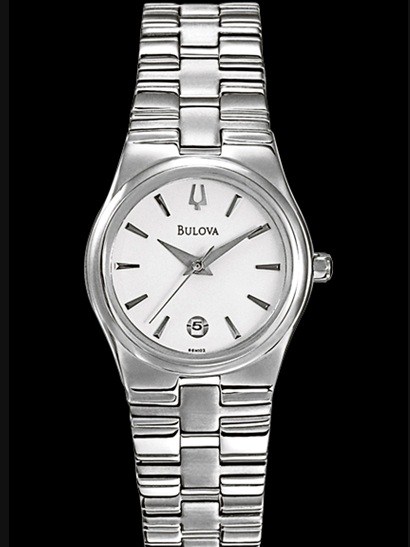 White patterned round dial. Date calendar. Stainless steel case and bracelet. Water resistant to 30 meters/100 feet.