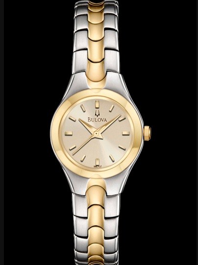 In stainless steel with two-tone finish, metalized crystal, champagne sunray dial, second hand, locking fold-over buckle and water resistance to 30 meters.