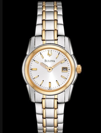 In stainless steel with two-tone finish, domed crystal, silver sunray dial, luminous hands and markers, calendar, second hand, screw0-back case, locking fold-over buckle and water resistance to 30 meters