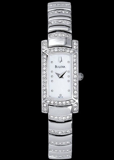 White mother-of-pearl dial. Swarovski® crystals. Curved crystal with metalized rim. Water resistant to 30 meters/100 feet.