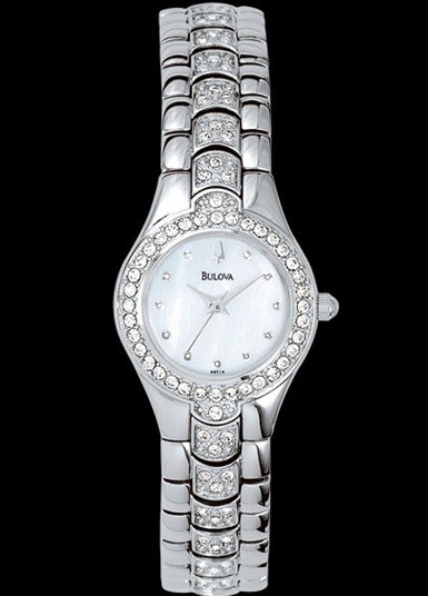 Bulova Ladies' Crystal Collection 96T14 White mother-of-pearl dial. Swarovski® crystals. Curved crystal with metalized rim. Water resistant to 30 meters/100 feet.