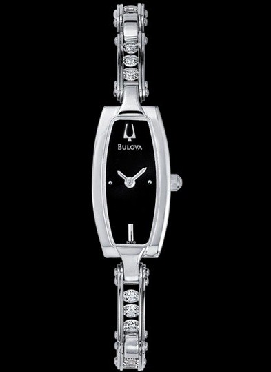 Black patterned dial. Curved crystals. Stainless steel bracelet. Water resistant to 30 meters/100 feet.