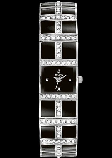 Crystal design in black enamel and silver finish with 88 individually hand-set genuine Swarovski® crystals on case and bracelet, metalized mineral crystal and black enamel east-west rectangular dial.