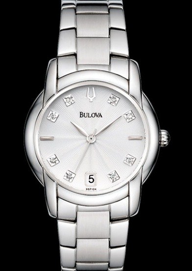 In stainless steel with 8 diamonds individually hand-set on a silver-white web sunray pattern dial, calendar, second hand, curved crystal, deployment buckle and water resistance to 30 meters.