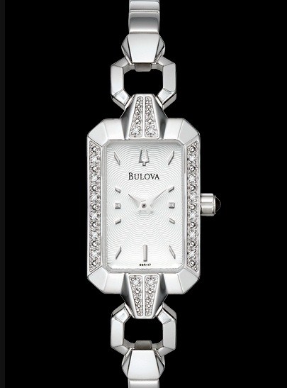 Bracelet design with 16 individually hand-set diamonds on case, curved faceted crystal, silver-white web pattern dial, black onyx cabochon crown and water resistance to 30 meters