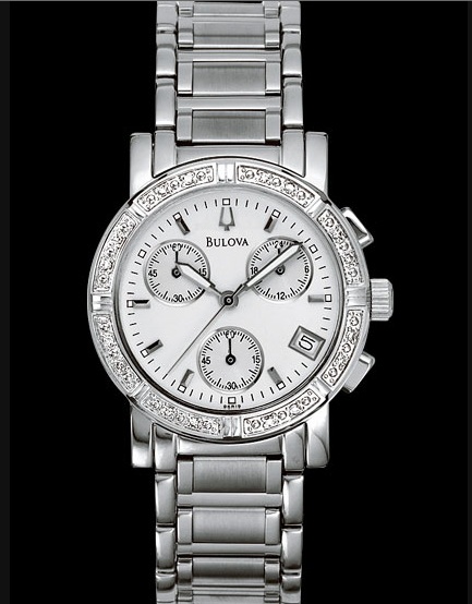 White pearlized dial. 16 diamonds. Chronograph. Stainless steel case and bracelet. Deployment buckle. Water resistant to 30 meters.