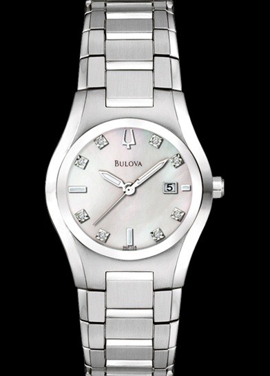 In stainless steel with 8 individually hand-set diamonds on white mother-of-pearl dial, domed metalized crystal, luminous hands and markers, calendar, second hand, deployment buckle and water resistance to 30 meters.