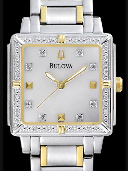 Stainless steel case with two tone bracelet, 24 diamonds individually hand-set on case, white mother-of-pearl dial, second hand, mineral crystal, deployment buckle and water resistance to 30 meters.