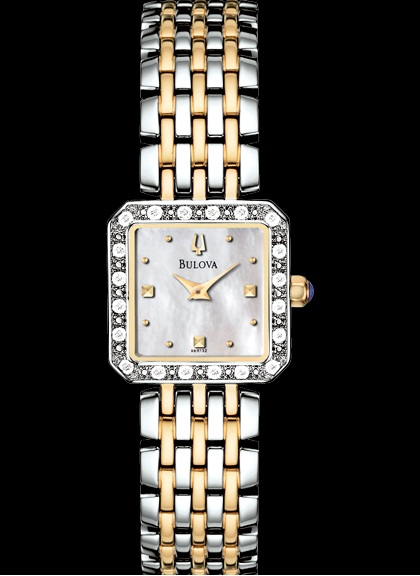 Stainless steel bracelet design in two-tone finish with 20 individually hand-set diamonds on bezel, white mother-of-pear dial, metalized crystal, blue cabochon crown, deployment buckle and water resistance to 30 meters.