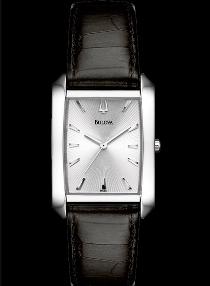 In stainless steel with curved metalized crysta, silver patterned dial, second hand, black leather strap, locking deployment buckle and water resistance to 30 meters.