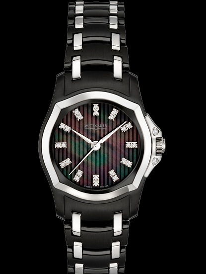 From the Montserrat Collection. Stunningly dramatic, this boldly contemporary design, with rich black ion-plating and a patterned black mother-of-pearl dial, includes 24 on-dial diamonds, in distinctive paired settings, plus 2 diamonds on the crown protector, all individually hand-set for maximum brilliance, a second hand, screw-back case and water resistance to 50 meters.