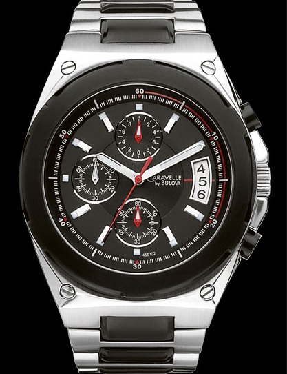 Chronograph in stainless steel with black aluminum bezel ring and bracelet inserts, black patterned dial, luminous hands, markers and subdial hands, calendar, second hand, mineral crystal, fold-over buckle with double pushers, and water resistance to 50 meters.