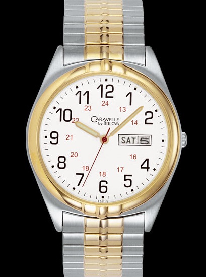 White dial. Luminous hands and markers. Stainless steel expansion bracelet. Water resistant to 30 meters / 100 feet.