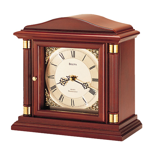 Solid wood case, Walnut finish, Metal dial with chapter ring and raised corner ornaments, Westminster melody on the hour, Protective glass lens, 4" x .5" engraving plate included.