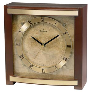 Solid wood case, Walnut finish, Brushed champagne gold aluminum accents on top and bottom, Genuine capiz shell dial, Gold finish raised chapter ring, Curved glass lens, 2.5" x .5" engraving plate included.