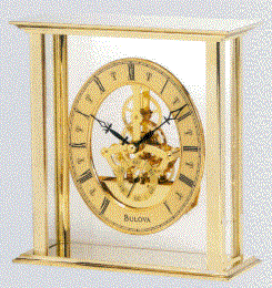 Solid brass case, Polished finish, Glass inserts in front and side, Acrylic back panel, Skeleton movement with seconds subdial.