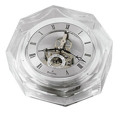 Octagonal crystal case, Hand cut and polished, Beveled edges, Skeleton movement with seconds subdial, Brushed aluminum background, 2" x .5" engraving plate included.