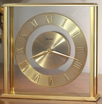 Metal case, Brushed and polished brass finish, Raised applied numerals on floating dial, Glass inserts in front and sides, 2.5" x .75" engraving plate included.