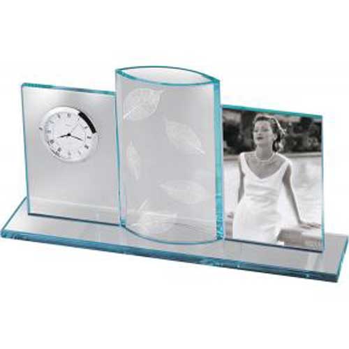 Mineral glass case, 3.5" x 5" photograph inserts into glass slip, Watertight center bud vase, Polished chrome bezel, Protective glass lens, 2" x .5" engraving plate included.