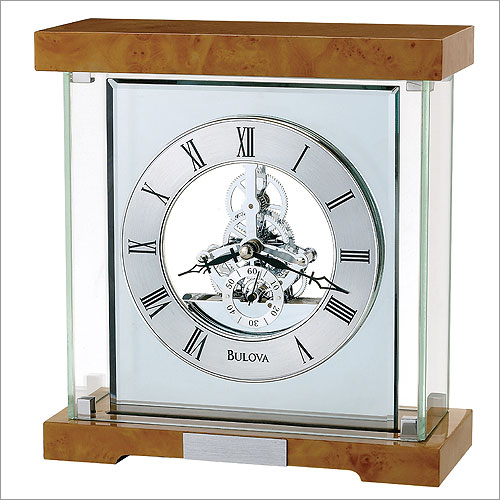 Wood base and top, High gloss finish over burl pattern veneer, Mirror panel, Skeleton movement with seconds subdial, Glass cover, 2" x .5" engraving plate included.