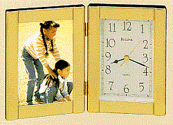 Hinged metal case, Polished brass finish, 3.5" x 5" photograph opening, Protective glass lens.