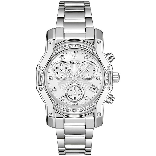 Polished stainless steel case and bracelet, Deployment clasp, 23 individually hand-set diamonds (16 on bezel and 7 on dial), Flat mineral crystal, Silver dial with silver-tone luminous hands, Chronograph, Date indicator at the 4 mark, Japanese quartz move"