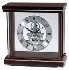 Wood case, Ebony veneer pattern with mahogany stain, Polished chrome inlaid accents and feet, Metal skeleton movement with seconds subdial, Wrap around glass lens, 2.5" x .5" engraving plate included.