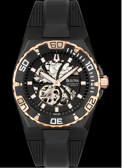 In stainless steel with rose-gold and black ion plating, rotating bezel, screw-back case, luminous hands and markers, second hand, patterned rubber strap and water resistance to 100 meters.
