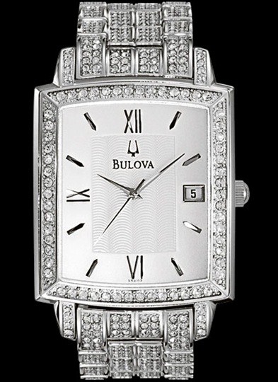 Crystal design with 386 individually hand-set genuine Swarovski� crystals on case, bezel and bracelet, curved metalized mineral crystal, silver patterned dial, calendar, second hand, 4-screw caseback, deployement buckle and water resistance to 30 meters.
