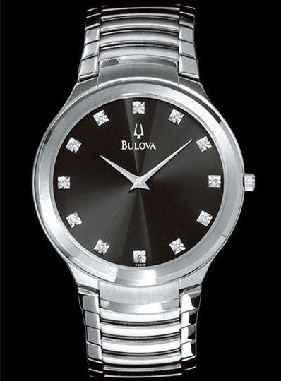 Charcoal gray patterned dial. 12 diamonds. Deployment buckle. Water ressitant to 30 meters/100 feet.