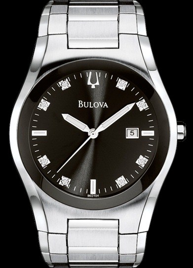 In stainless steel with 8 individually hand-set diamonds on black sunray dial, domed metalized crystal, luminous hands and markers, calendar, second hand, deployment buckle and water resistance to 30 meters.
