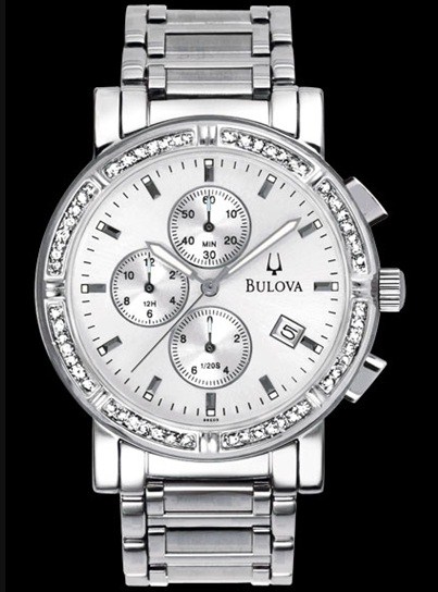 White dial. 24 diamonds. Chronograph. Stainless steel case and bracelet. Deployment buckle. Water resistant to 30 meters / 100 feet.