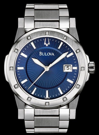 In stainless steel with 12 individually hand-set diamonds on bezel, metalized crystal, blue embossed sunray dial, luminous hands, calendar, second hand, locking deployment buckle and water resistance to 30 meters.