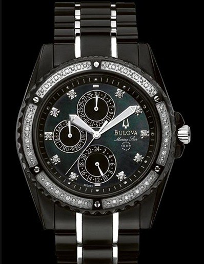 Brilliantly highlighted by 34 individually hand-set diamonds-24 on case and 10 on the black mother-of-pearl dial-this elegant high-performance multifunction sports watch in stainless steel with black ion plating and polished stainless steel accents, luminous hand, second hand, screw-back case, deployment buckle and water resistance to 100 meters