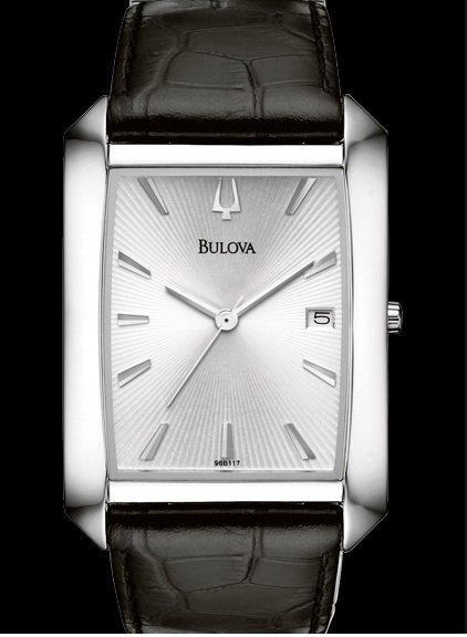 In stainless steel with curved metalized crystal, silver patterned dial, calendar, second hand, black leather strap, locking deployment buckle and water resistance to 30 meters.