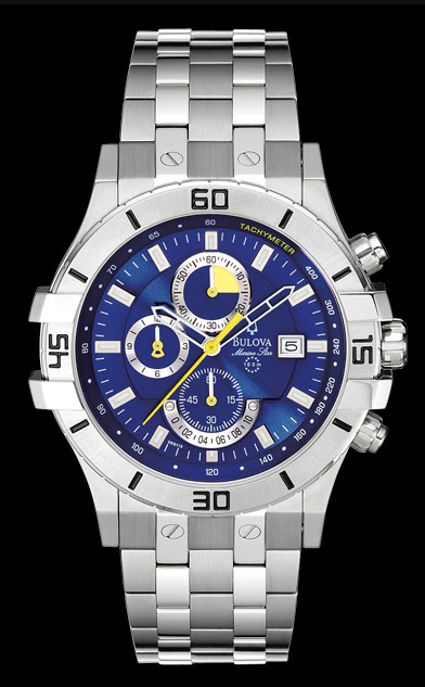 From the Marine Star Collection. High-performance chronograph in stainless steel with blue sunray dial, luminous hands and markers, calendar, second hand, tachymeter scale, screw-back case, fold-over buckle with safety lock, and water resistance to 100 meters