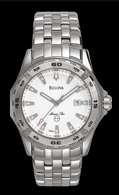 White matte dial. Unidirectional ratchet bezel ring. Stainless steel case and bracelet. Screw back. Double push-button fold-over buckle with safety bar. Water resistant to 100 meters/330 feet.