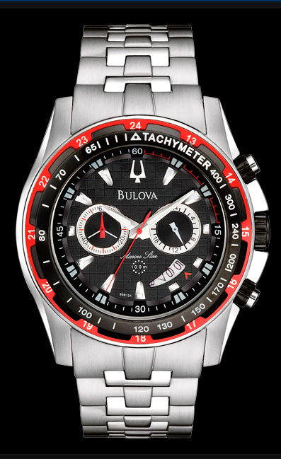 From the Marine Star Collection. High-performance chronograph in stainless steel with black ion-plated and red anodized aluminum accents, black patterned dial, curved calendar window, 24-hour subdial, luminous hands and markers, tachymeter, screw-back case, fold-over buckle with double-pushers and safety lock, and water resistance to 100 meters