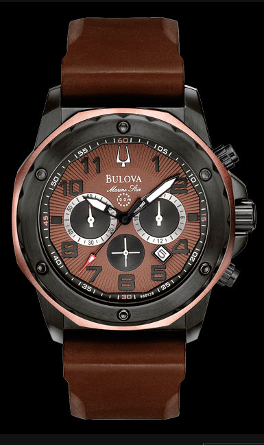From the Marine Star Collection. High-performance chronograph in stainless steel with black and brown ion plating, brown patterned dial with black patterned subdials, luminous hands, calendar, small sweep, screw-back case, brown rubber strap, and water resistance to 100 meters