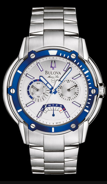 From the Marine Star Collection. Multifunction timepiece in stainless steel with blue anodized aluminum bezel ring, domed crystal, silver-white patterned dial with blue accents, retrograde day indicator, 24-hour and date subdials, luminous hands and markers, second hand, screw-back case, fold-over buckle with double pushers, safety lock and extender, and water resistance to 100 meters