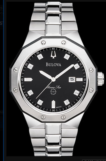 Black color dial. 8 diamonds. Luminous hands. Screw back. Fold over buckle/safety clasp. Water resistant to 100 meters/330 feet.