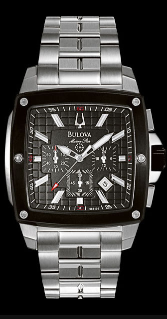 From the Marine Star Collection. High-performance chronograph in stainless steel with silver and black ion-plated finish, curved metalized mineral crystal, black patterned dial, luminous hands and markers, calendar, second hand, 7-screw caseback, locking deployment buckle and water resistance to 100 meters.
