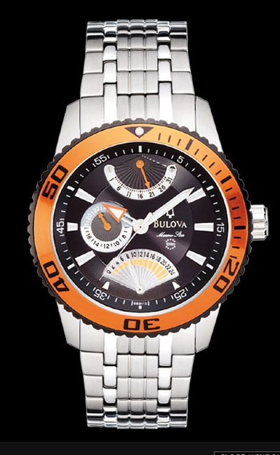 From the Marine Star Collection. High-performance multifunction sports watch in stainless steel with black patterned dial,silver sun-ray date and seconds subdials, silver day indicator with retrograde hand, luminous hands, screw-back case, unidirectional elapsed time bezel,fold-over buckle with safety lock, and water resistance to 100 meters.