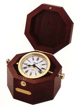 Solid wood chest, Mahogany finish, Polished brass case, Suspended gimbal clock adjusts for viewing angle, Beep alarm, 4.25" x 4.25" engraving plate included.