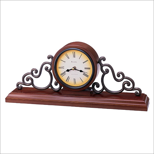 Solid wood case, Walnut finish, Metal scroll accents in antique copper finish, Matte black finish, Metal benzel, Westminster melody on the hour, Convex glass lens.